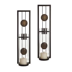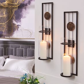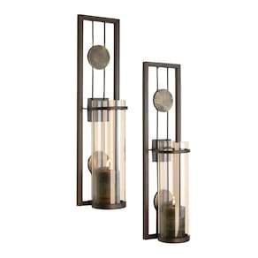 Adicione um toque elegante e romântico à decoração da sua casa com um conjunto de arandelas de parede contemporâneas Danya B. Este conjunto elegante e contemporâneo de arandelas de parede apresenta um suporte de ferro com um design abstrato moderno de formas geométricas. As arandelas sofisticadas têm castiçais cilíndricos feitos de vidro transparente. Acenda suas velas de pilar ou use velas sem chama com um temporizador à noite e veja o brilho suave da luz tocar lindamente fora das arandelas. Aqueça seu espaço e crie uma atmosfera com a combinação perfeita de estilo moderno e pátina antiga. Os castiçais de vidro adicionam um toque de romance e elegância à sua casa, iluminando a sala com um calor suave que fará com que qualquer cômodo da sua casa pareça convidativo. Os furacões de vidro são removíveis e facilitam a limpeza e manutenção.