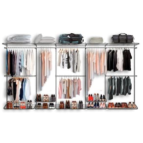 Este produto possui uma configuração unissex, contendo cabideiro com dois níveis e cabideiro para longos. As prateleiras / maleiros pontuam os módulos fazendo o perímetro, assim como as sapateiras na parte inferior. Você poderá brincar com as peças intercambiando entre módulos.