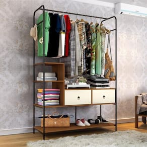 Com design industrial, possui 3 prateleiras e 2 gavetas, que ajudam a manter as roupas arrumadas.