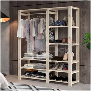 Estante arara com prateleiras e estrutura em madeira maciça de Pinus.