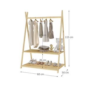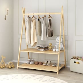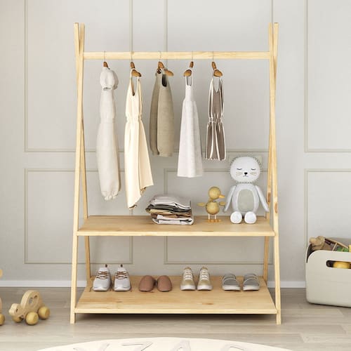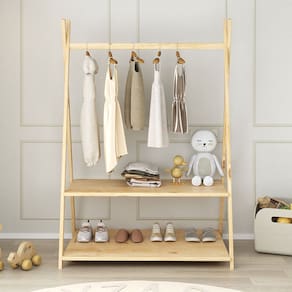O cabideiro tem altura acessível para pendurar roupinhas com facilidade, e as duas prateleiras permitem organizar sapatos, brinquedos e objetos do dia a dia.