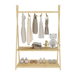 O Cabideiro Infantil Para Crianças Madeira Maciça Danilo possui estrutura em madeira natural e prateleiras brancas, trazendo leveza e um toque moderno para quartos montessorianos.