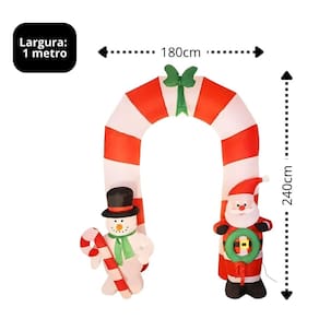 Transforme sua decoração natalina com um toque mágico e encantador com o Arco Inflável Natalino com LED, modelo gigante de 2,4 metros de altura, que traz todo o espírito do Natal em grande estilo! Com visual vibrante e alegre, o arco possui listras vermelhas e brancas, laço verde central decorativo, e nas laterais os personagens mais queridos da época: Papai Noel e Boneco de Neve, ambos sorridentes e prontos para receber seus convidados.