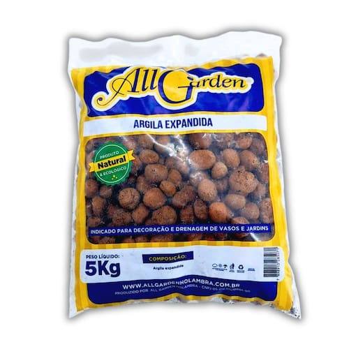 Características * Produto: Argila Expandida * Marca: All Garden * Peso Líquido: 5 kg * Composição: Argila natural expandida * Aspecto: Grânulos arredondados e leve. * Cor: Marrom * Leveza: Material de baixa densidade, não adiciona peso excessivo a vasos e estruturas. * Alta Porosidade: Permite excelente circulação de ar e retenção de água. * Sustentabilidade: Produto natural e ecológico.