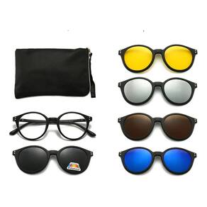 Item: 1 Óculos de lente transparente (Pode colocar grau) + 5 Lentes Clip On (Lente amarela, azul (espelhada), marrom, prateada (espelhada) e preta) para serem utilizadas por cima do óculos.