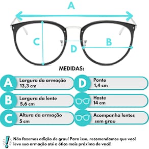 Largura total da armação: 13,3 cm Largura da lente: 5,6 cm Altura da armação: 5 cm Ponte: 1,4 cm Comprimento da haste: 14 cm