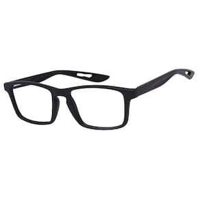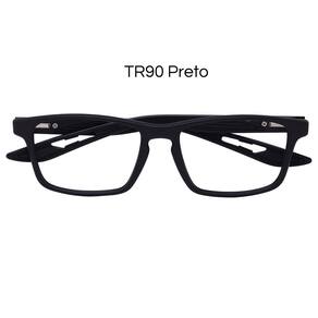É feita em TR90, em formato retangular, na cor preta, muito leve, confortável e resistente.