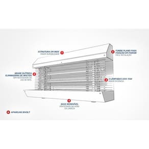 ======== indústria brasileira ======== - armadilha luminosa super foco - modelo sg-01. (modelo de parede) - o modelo extinsect® sg-01 possibilita uma instalação mais próxima do local a ser protegido, o que torna sua ação mais focada. - utiliza lâmpadas uv-a com frequência de onda especifica, atraindo os insetos para sua grade que libera uma pequena descarga elétrica, eliminando-os de forma eficaz e segura. - os aparelhos mata moscas extinsect® são feitos em aço inox e alumínio, garantindo assim sua leveza, higiene e durabilidade. Ideal para todos os locais que necessitam de um controle efetivo e seguro, das possíveis contaminações causadas por insetos voadores. - é comprovadamente um sistema eletrônico eficaz, pratico e higiênico, sem a utilização de produtos químicos. ======== equipamento de acordo com as normas da anvisa ======== - características: --- cor: inox --- área de atuação: máximo 60m² --- tipo de lâmpada: 2x lâmpada uva-15w --- voltagem: bivolt (chave seletora) --- potência máxima: 40 watts --- indicação: serve para todos os ambientes --- modo de funcionamento: automático --- tipos de inseto que elimina: voadores --- ambiente: uso comercial, industrial e doméstico --- garantia: 90 dias --- produz vapor: não - aplicação: --- as armadilhas luminosas são equipamentos importantes no controle integrado de pragas (cip) e principalmente para o combate aos insetos voadores. - modo de uso: --- basta conectá-lo na tomada e os insetos que estiverem próximos serão atraídos pela luz.