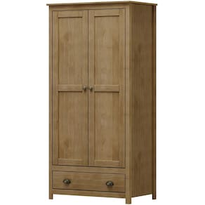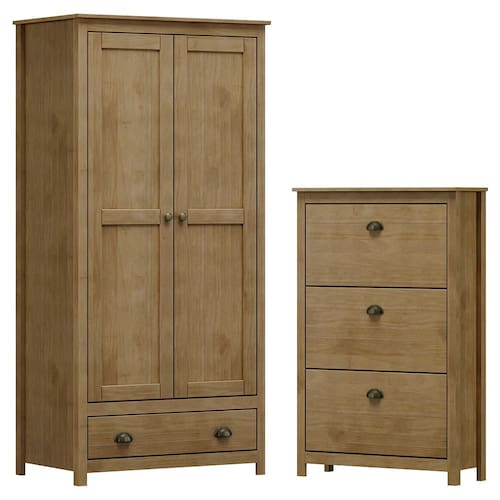 Conjunto Armário e Sapateira projetado para quem busca móveis sofisticados e atemporais. Produzido em madeira maciça de pinus de reflorestamento, sua estrutura robusta garante durabilidade e resistência. Seu acabamento com pintura acetinada em verniz PU e UV realça a beleza natural da madeira enquanto protege contra desgastes do dia a dia. O Armário possui 02 portas com dobradiças com amortecimento, e 01 gaveta com corrediças telescópicas, permitindo uma abertura suave e silenciosa. Além de 01 cabideiro em alumínio, e 03 prateleiras sendo 02 removíveis, podendo ajustar o espaço interno conforme a necessidade. A Sapateira conta com 03 gavetas com compartimentos específicos para calçados e amplo espaço para armazenamento, comportando até 18 pares. O design funcional apresenta também puxadores metálicos no estilo concha que agregam um charme artesanal, enquanto os pés alongados em madeira trazem leveza e sofisticação ao móvel. Estes móveis chegarão em sua casa separados em 03 volumes.
