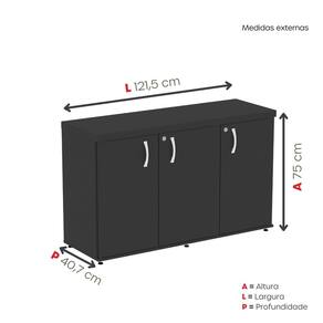 Ideal para escritórios, salas de reunião ou home office. Acabamento da Porta: BP Acabamento da Prateleira: BP Acabamento dos Pés: Polipropileno Ambiente Principal: Escritório Armário Suspenso: Não Complexidade da Montagem: Média: pode ser montado por mais de uma pessoa e/ou necessite de maior conhecimento para montagem Cor: Preto Cor do Produto: Preto Cor Interna: Preto Escala de Brilho: Semi-Fosco Escala de Brilho da Porta: Semi-Fosco Escala de Brilho da Prateleira: Semi-Fosco Espessura do Tampo: 40 mm Formato do Armário: Retangular Itens Inclusos: 1 Armário e Kit Ferragens Linha ou Coleção: PE40 Manual de Montagem e Instalação: https://product-hub-prd.madeiramadeira.com.br/459117666/documents/41b0e58f-ee7a-43ef-bda3-bb8e5a0c088a3144221387017555271061887.pdf Marca: Pandin Móveis Material da Porta: MDP Material da Prateleira: MDP Material do Puxador da Porta: Poliestireno Material dos Pés: Polipropileno Material Principal: MDP Necessita Montagem: Sim Orientação do Armário: Horizontal Origem do Produto: Nacional Pés Reguláveis: Sim Peso: 38,804 kg Peso Máximo por Prateleira: 15 kg Possui Espelho: Não Possui Mesa Retrátil: Não Possui Nicho: Não Possui Pés: 06 Possui Portas: 03 Possui Prateleiras: 03 Quantidade de Armários: 1 Recomendações de Uso, Manutenção e Limpeza: Utilizar um pano levemente umedecido com água, para finalizar utilizar um pano seco. Sapatas Niveladoras: Sim Sistema de Montagem: parafuso Suporta Até (kg): 45 kg Tamanho do Armário: Baixo (Até 90cm) Tipo de Armário: Totalmente Fechado Tipo de Dobradiça/Corrediça da Porta: Aço Tipo de Puxador da Porta: Externo Marca: Não Informado