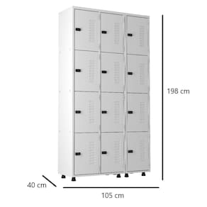 O Armário Roupeiro de Aço 12 Portas Vestiário Academia Guarda-Volumes com trinco para cadeados é perfeito para alojamentos, escritórios, almoxarifados, laboratórios, hospitais, farmácias, depósitos, academias, supermercados, vestiários, e diversos outros ambientes.