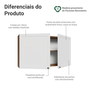 O acabamento de alta resistência da estrutura é em tom amadeirado Rustic e das frentes em Branco. Possui uma textura suave ao toque, trazendo leveza e sofisticação ao ambiente. O destaque vai para os puxadores ponto em ouro envelhecido, feitos com metal resistente, que adicionam personalidade e um charme único. Outro diferencial está no detalhe chanfrado das frentes, que forma molduras elegantes e dá profundidade ao design, refletindo o estilo americano com um toque moderno.
