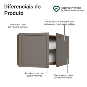 O acabamento de alta resistência da estrutura é em tom amadeirado Rustic e das frentes em Cinza. Possui uma textura suave ao toque, trazendo leveza e sofisticação ao ambiente. O destaque vai para os puxadores ponto em ouro envelhecido, feitos com metal resistente, que adicionam personalidade e um charme único. Outro diferencial está no detalhe chanfrado das frentes, que forma molduras elegantes e dá profundidade ao design, refletindo o estilo americano com um toque moderno.