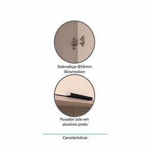 Caracteristicas Estrutura: MDP 15mm Acabamento da Caixaria/Corpo: PF Acabamento das Portas/Frontal: BP Quantidade de Portas: 3 de Abrir Tipo de Dobradicas: Metalicas 35mm Slow Motion Quantidade e Tipo de Puxadores: 3 Puxadores em Aluminio Preto Sistema de Montagem: Cavilhas e parafusos. Garantia do Fabricante: 3 meses Itens inclusos: Armario aereo, manual de montagem, ferragens e acessorios.