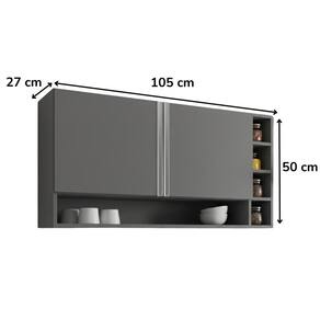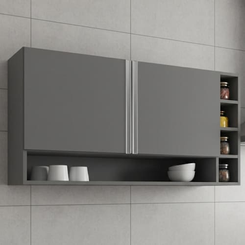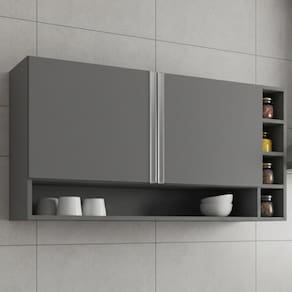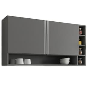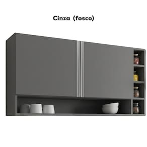 Armário Aéreo Vanessa, ideal para otimizar o espaço da sua cozinha. Produzido em MDP 12/15 mm (fundo 3 mm) com acabamento em pintura UV. Possui portas com dobradiças metálicas e puxadores em alumínio, além de nicho central e lateral estilo adega para armazenar garrafas ou temperos, oferecendo amplo espaço interno. Produto entregue em 01 volume.