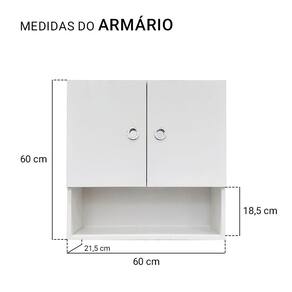 Suas medidas são: Medida Total: 60cm altura x 60cm largura x 21,5cm profundidade. Parte interna do Nicho Inferior: 18,5cm altura x 21,5cm profundidade. Produto contém fundo na parte de trás do armário.