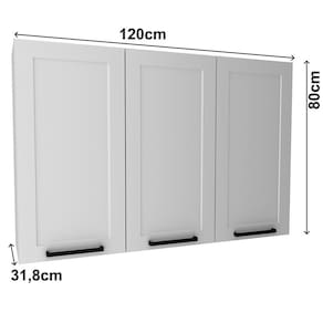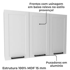 O Armário Aéreo ideal para o dia a dia. Produzido 100% em MDF de 15mm (fundo de 3mm), com acabamento em pintura UV (brilho) que garante durabilidade. Móvel suspenso com 3 portas equipadas com dobradiças reta caneco de 35mm e amortecedor slow motion, usinagem em baixo relevo no estilo provençal, bordas em PVC que oferecem maior proteção e puxadores em alumínio. Perfeito para quem busca organização, funcionalidade e elegância para a cozinha. Este móvel será entregue em 02 volumes.
