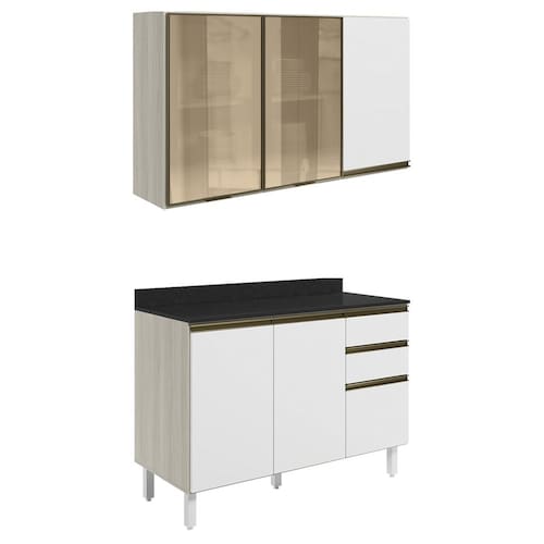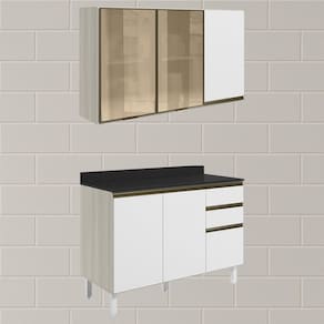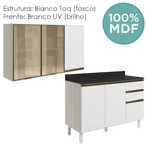 MDFConjunto de Armário Aéreo 3 Portas e Balcão com Tampo para cozinha, funcional e moderno, ideal para composições que otimizam o espaço com elegância. Fabricado 100% em MDF, com estrutura e tampo de 15mm, forro de fundo de 3mm e acabamento em pintura UV (fosco ou brilho). O Conjunto é composto por 1 armário aéreo com 2 portas de vidro reflecta e 1 em MDF com dobradiças de 35mm com amortecedor, que garantem fechamento suave e silencioso, além de puxadores em perfil de alumínio e 2 prateleiras internas. O Balcão com tampo 15mm que conta com 3 gavetas com corrediças telescópicas, 1 prateleira interna e 2 portas com dobradiças de 35mm com amortecedores. Os 5 pés possuem altura de 15,5cm com regulagem adicional de 1,5cm, garantindo estabilidade em qualquer piso. Estes móveis chegarão em sua casa separados em 05 volumes.