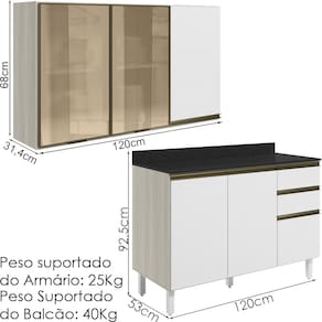 Peso Suportado do Balcão: 40Kg (20Kg tampo, 12Kg gavetas e 8Kg prateleira)