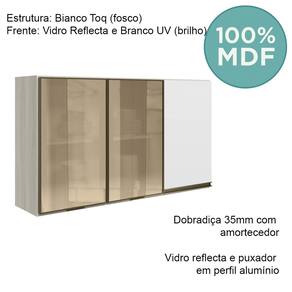 Armário Aéreo para cozinha desenvolvido para composições modernas e funcionais. Fabricado 100% em MDF, com estrutura de 15 mm e forro de fundo de 3 mm. Além disso conta com 2 portas de vidro reflecta e 1 em MDF com dobradiças de 35mm com amortecedor, que garantem fechamento suave e silencioso, e 1 prateleira interna. Os puxadores em perfil de alumínio completam o produto com um visual funcional e moderno, enquanto o vidro reflecta traz um toque sofisticado e reflexivo. Este móvel chegará em sua casa separado em 02 volumes.