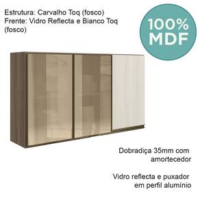 Armário Aéreo para cozinha desenvolvido para composições modernas e funcionais. Fabricado 100% em MDF, com estrutura de 15 mm e forro de fundo de 3 mm. Além disso conta com 2 portas de vidro reflecta e 1 em MDF com dobradiças de 35mm com amortecedor, que garantem fechamento suave e silencioso, e 1 prateleira interna. Os puxadores em perfil de alumínio completam o produto com um visual funcional e moderno, enquanto o vidro reflecta traz um toque sofisticado e reflexivo. Este móvel chegará em sua casa separado em 02 volumes.