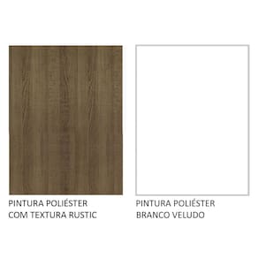 O acabamento da estrutura é no padrão amadeirado Rustic e as portas em Branco Veludo. É feito em Pintura Poliéster ecológica, que protege o móvel contra os efeitos da água e do calor.