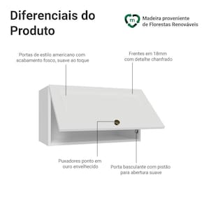 O acabamento de alta resistência da estrutura e das portas é em Branco. Possui uma textura suave ao toque, trazendo leveza e sofisticação ao ambiente. O destaque vai para os puxadores ponto em ouro envelhecido, feitos com metal resistente. Outro diferencial está no detalhe chanfrado das frentes, que forma molduras elegantes e dá profundidade ao design, refletindo o estilo americano com um toque moderno.