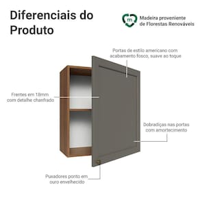 O acabamento de alta resistência da estrutura é em tom amadeirado Rustic e das portas em Cinza. Possui uma textura suave ao toque, trazendo leveza e sofisticação ao ambiente. O destaque vai para os puxadores ponto em ouro envelhecido, feitos com metal resistente. Outro diferencial está no detalhe chanfrado das frentes, que forma molduras elegantes e dá profundidade ao design, refletindo o estilo americano com um toque moderno.