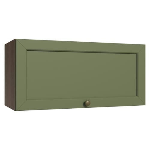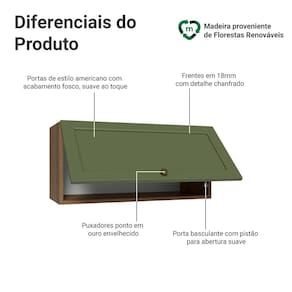 O acabamento de alta resistência da estrutura é em tom amadeirado Rustic e da porta em Verde. Possui uma textura suave ao toque, trazendo leveza e sofisticação ao ambiente. O destaque vai para os puxadores ponto em ouro envelhecido, feitos com metal resistente. Outro diferencial está no detalhe chanfrado das frentes, que forma molduras elegantes e dá profundidade ao design, refletindo o estilo americano com um toque moderno.