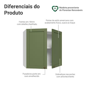 O acabamento de alta resistência da estrutura é em Branco e das portas em Verde. Possui uma textura suave ao toque, trazendo leveza e sofisticação ao ambiente. O destaque vai para os puxadores ponto em ouro envelhecido, feitos com metal resistente, que adicionam personalidade e um charme único. Outro diferencial está no detalhe chanfrado das frentes, que forma molduras elegantes e dá profundidade ao design, refletindo o estilo americano com um toque moderno.
