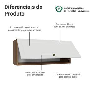 O acabamento de alta resistência da estrutura é tom amadeirado Rustic e da porta em Branco. Possui uma textura suave ao toque, trazendo leveza e sofisticação ao ambiente. O destaque vai para os puxadores ponto em ouro envelhecido, feitos com metal resistente. Outro diferencial está no detalhe chanfrado das frentes, que forma molduras elegantes e dá profundidade ao design, refletindo o estilo americano com um toque moderno.