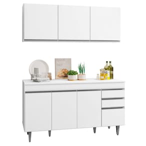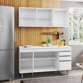 Quanto ao acabamento e estrutura também não há o que questionar, porque são fabricados em MDP 15mm com acabamento BP e os puxadores em alumínio modelo cava dão um toque de modernidade. Para completar, o tampo em MDP 15mm agrega ainda mais utilidade, uma vez que você pode fazer uso de itens decorativos ou até criar aquele cantinho do café, deixando o ambiente muito mais bonito, até porque o coração da casa merece esse cuidado.