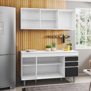 Quanto ao acabamento e estrutura também não há o que questionar, porque são fabricados em MDP 15mm com acabamento BP e os puxadores em alumínio modelo cava dão um toque de modernidade. Para completar, o tampo em MDP 15mm agrega ainda mais utilidade, uma vez que você pode fazer uso de itens decorativos ou até criar aquele cantinho do café, deixando o ambiente muito mais bonito, até porque o coração da casa merece esse cuidado.