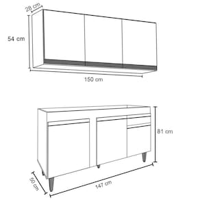 Dimensões dos Produtos (Largura x Altura x Profundidade): Armário Aéreo: 150 x 54 x 28 cm.