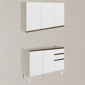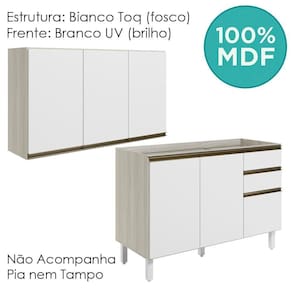 Conjunto de Armário Aéreo e Balcão sem Tampo para Pia, funcional e moderno, ideal para composições que otimizam o espaço com elegância. Fabricado em MDF, com estrutura de 15mm, forro de fundo de 3mm e acabamento em pintura UV (fosco ou brilho). O Conjunto é composto por 1 armário aéreo com 3 portas com dobradiças de 35mm com amortecedor, que garantem fechamento suave e silencioso, além de puxadores em perfil de alumínio e 2 prateleiras internas. O Balcão conta com 3 gavetas com corrediças telescópicas, 1 prateleira interna e 2 portas com dobradiças de 35mm com amortecedores. Os 5 pés possuem altura de 15,5cm com regulagem adicional de 1,5cm, garantindo estabilidade em qualquer piso. Não acompanha tampo nem pia. Estes móveis chegarão em sua casa separados em 04 volumes.