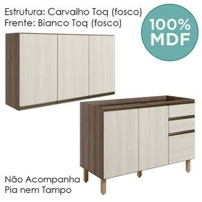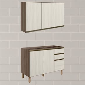 Conjunto de Armário Aéreo e Balcão sem Tampo para Pia, funcional e moderno, ideal para composições que otimizam o espaço com elegância. Fabricado 100% em MDF, com estrutura de 15mm, forro de fundo de 3mm e acabamento em pintura UV (fosco ou brilho). O Conjunto é composto por 1 armário aéreo com 3 portas com dobradiças de 35mm com amortecedor, que garantem fechamento suave e silencioso, além de puxadores em perfil de alumínio e 2 prateleiras internas. O Balcão conta com 3 gavetas com corrediças telescópicas, 1 prateleira interna e 2 portas com dobradiças de 35mm com amortecedores. Os 5 pés possuem altura de 15,5cm com regulagem adicional de 1,5cm, garantindo estabilidade em qualquer piso. Não acompanha tampo nem pia. Estes móveis chegarão em sua casa separados em 04 volumes.