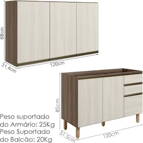 Peso Suportado do Balcão: 20Kg (12Kg gavetas e 8Kg prateleira)