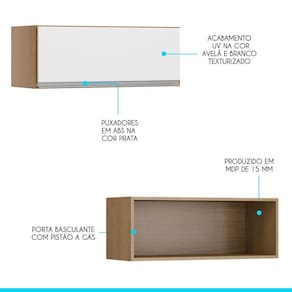 Armário Aéreo Basculante Sabrina 80x30cm Mdp Menu Móveis Branco Avelã O Armario Aereo Basculante de Cozinha Sabrina foi desenvolvido para atender todas as suas necessidades diarias com um design moderno, cheio de personalidade, beleza e versatilidade. Por se tratar de armario de cozinha modulado voce pode ajustar os modulos conforme o espaco disponivel e montar diversas modulacoes diferentes para deixar o ambiente muito mais aconchegante. Atende sofisticacao e amplo espaco para seus utensilios, dando aquela organizacao que sempre buscamos. A elegancia fica por conta dos puxadores em perfil na cor prata dando um toque unico de sofisticacao. Produzido com materiais de excelente qualidade, garantindo a durabilidade e vida util. O melhor em moveis no design atual aliando conforto, qualidade e otimos precos, so na Menu Moveis! Caracteristicas: Produzido em MDP de 15 mm Acabamento em Pintura UV na cor Avela e Branco Texturizado Porta Basculante com Pistao a Gas Puxador Perfil em ABS na cor Prata Prateleira suporta 5 Kg