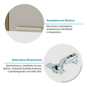 Desenvolvida com materiais de excelencia, a Cozinha Isis oferece excelente distribuicao de espaco interno. E estruturada em 100 MDP e possui dobradicas slow motion com amortecedor incorporado para fechamento suave das portas. Conta com puxadores tipo Aste em Plastico Gold dando um toque especial de classe e elegancia.