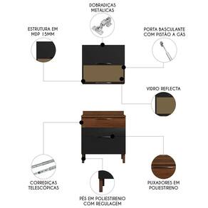 O Armário Aéreo dispõe de duas portas basculantes, sendo uma delas com vidro reflecta, com dobradiças metálicas e pistão a gás, que oferece suavidade no abrir e fechar, proporcionando mais conforto e evitando impactos. Já o Balcão também com uma porta basculante, conta com um gavetão com corrediças telescópicas e são todos equipados com puxadores em poliestireno. O Armário de Cozinha possui um ótimo espaço interno para acomodar utensílios, como panelas, louças e muito mais, mantendo tudo sempre organizado de forma eficiente. É fabricado em MDP 15mm e apresenta acabamento em pintura fosca texturizada na estrutura e acetinada nas portas, com secagem realizada por luzes UV, que conferem um toque sofisticado e um visual moderno. O tampo serve como apoio para eletrodomésticos ou no preparo de alimentos, ele acompanha rodatampo, que é um excelente acabamento entre o balcão e a parede. Os pés, também em poliestireno, são reguláveis, permitindo ajustar pequenos desníveis de piso e manter a estabilidade do produto.