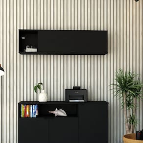 O Armário Aéreo com Nicho e Porta Basculante WorkLab é uma peça de mobiliário que alia design contemporâneo e funcionalidade avançada, ideal para escritórios que buscam otimizar o espaço vertical. Com linhas retas e um visual clean, oferece um espaço aberto para decoração ou para manter itens essenciais bem organizados. A porta basculante com pistão a gás permite um acesso fácil e um fechamento suave, evitando impactos e ruídos, além do puxador em alumínio, discreto e funcional. O Armário Aéreo WLNP135 WorkLab é uma solução inteligente que combina estética e praticidade, ideal para manter o ambiente de trabalho organizado e elegante. Acabamento da Porta: BP Acetinado Ambiente Principal: Escritório Complexidade da Montagem: Alta: deve ser montado por um montador especializado Cor: Preto Cor do Produto: Preto Cor Interna: Preto Escala de Brilho: Fosco Escala de Brilho da Porta: Fosco Itens Inclusos: 1 Nicho Manual de Montagem e Instalação: https://cdn2.madeiramadeira.com.br/atributo/compace-dalex/2349613-1708-17266660942491.pdf Material da Porta: MDP Material do Puxador da Porta: Alumínio Material Principal: MDP Necessita Montagem: Sim Origem do Produto: Nacional Peso: 17,175 kg Possui Espelho: Não Possui Nicho: Sim Possui Pés: Não Possui Portas: 01 Possui Prateleiras: Não Recomendações de Uso, Manutenção e Limpeza: Para a limpeza, utilize flanela seca ou pano macio levemente umedecido em água. Utilize um pano seco em seguida. Evite contato com produtos químicos (solventes, thinner, acetona, etc) e não utilize nenhum tipo de esponja de aço. Sapatas Niveladoras: Sim Sistema de Montagem: Parafuso, Cavilha, Minifix, Dobradiça, Prego e sapata niveladora Suporta Até (kg): 15 kg Tipo de Dobradiça/Corrediça da Porta: Metálica Tipo de Puxador da Porta: Externo