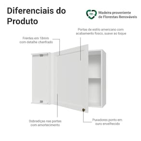 O acabamento de alta resistência da estrutura e das portas é em branco. Possui uma textura suave ao toque, trazendo leveza e sofisticação ao ambiente. O destaque vai para os puxadores ponto em ouro envelhecido, feitos com metal resistente, que adicionam personalidade e um charme único. Outro diferencial está no detalhe chanfrado das frentes, que forma molduras elegantes e dá profundidade ao design, refletindo o estilo americano com um toque moderno.