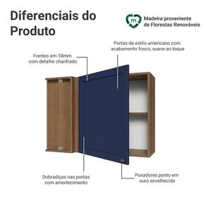 O acabamento de alta resistência da estrutura é em tom amadeirado Rustic e da porta em Azul. Possui uma textura suave ao toque, trazendo leveza e sofisticação ao ambiente. O destaque vai para os puxadores ponto em ouro envelhecido, feitos com metal resistente, que adicionam personalidade e um charme único. Outro diferencial está no detalhe chanfrado das frentes, que forma molduras elegantes e dá profundidade ao design, refletindo o estilo americano com um toque moderno.