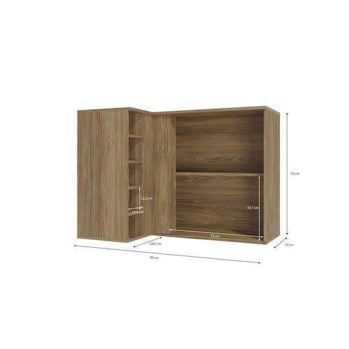 Sua cozinha ainda mais linda, prática e moderna com o aéreo de canto M636 da cozinha Botanic Kappesberg. Com dobradiça com amortecedor nas portas e produzido em MDP, material de alta qualidade, sua cor nogueira em pintura touch, conta com a textura dos veios da madeira. Ela traz ainda elementos da marromza para dentro da sua casa, e uma sensação de conforto e aconchego ao ambiente, além de combinar com a composição de cores dos balcões. Com uma porta, nicho garrafeiro e duas prateleiras, é uma peça indispensável em suas composições em "L", além de contar com o espaço ideal para organizar louças e mantimentos, fechando uma ótima combinação com o balcão do mesmo tamanho. Deixe sua cozinha de cara nova e receba sua família e amigos com a linha de produtos Kappesberg. Acabamento da Prateleira: Pintura UV Escala de Brilho da Prateleira: Fosco Acabamento da Porta: Pintura UV Escala de Brilho da Porta: Fosco Material do Puxador da Porta: Plástico Ambiente Principal: Cozinha codigo_ean: 7909903339190 Complexidade da Montagem: Média: pode ser montado por mais de uma pessoa e/ou necessite de maior conhecimento para montagem Cor: Nogueira Cor do Produto: Nogueira Escala de Brilho: Fosco Itens Inclusos: 1 Armário, Kit Ferragens e Manual de Montagem Manual de Montagem e Instalação: https://product-hub-prd.madeiramadeira.com.br/838241/documents/8abe2428-5c37-4912-b52c-daf928d3e1ff1272998m636.pdf Material da Dobradiça/Corrediça da Porta: Metálica Material da Porta: MDP Material da Prateleira: MDP Necessita Montagem: Sim Origem do Produto: Nacional Peso: 29,5661 kg Peso Máximo por Prateleira: 7 kg Possui Espelho: Não Possui Possui Pés: Não Possui Portas: Sim Possui Prateleiras: Sim Produto Montado: Sim Recomendações de Uso, Manutenção e Limpeza: use um pano limpo e ligeiramente umedecido em água ou álcool (recomendamos álcool etílico hidratado). Logo após, seque a superfície com um pano seco e macio. Em grandes superfícies limpe pequenas áreas de cada vez, trabalhando de baixo para cima. Sapatas Niveladoras: Não Sistema de Montagem: Parafuso Philips Suporta Até (kg): 15 kg Tipo de Dobradiça/Corrediça da Porta: Simples Tipo de Puxador da Porta: Externo