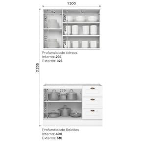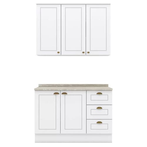 No estilo provençal com conceito inspirado nas cozinhas estilo americano. Um conjunto modular de cozinha sendo 3 peças: 1 armário aéreo 3 portas 120 cm, 1 balcão de 120 cm e 1 tampo de 120 cm. Todo o conjunto com estrutura feita 100% MDF de 15mm (fundo com 3mm, tampo em MDP de 25mm) , portas com dobradiças metálicas 35 mm com amortecimento e fechamento suave, e 3 gavetas com corrediças telescópicas, suportando 3kg cada, sua interna conta com 4 prateleiras espaçosas, cada uma suportando até 8 kg. Cozinha com acabamento em pintura UV texturizada, com portas e gavetas com detalhes de usinagem em baixo relevo que proporciona beleza e facilidade ao limpar, além do destaque em seus puxadores em metal zamac, tampo de 120 x 53,5 cm. Este móvel chegará na sua casa separado em 03 volumes.