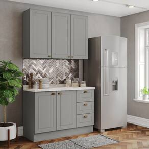 No estilo provençal com conceito inspirado nas cozinhas estilo americano. Um conjunto modular de cozinha sendo 3 peças: 1 armário aéreo 3 portas 120 cm, 1 balcão de 120 cm e 1 tampo de 120 cm. Todo o conjunto com estrutura feita 100% MDF de 15mm (fundo com 3mm, tampo em MDP de 25mm) , portas com dobradiças metálicas 35 mm com amortecimento e fechamento suave, e 3 gavetas com corrediças telescópicas, suportando 3kg cada, sua interna conta com 4 prateleiras espaçosas, cada uma suportando até 8 kg. Cozinha com acabamento em pintura UV texturizada, com portas e gavetas com detalhes de usinagem em baixo relevo que proporciona beleza e facilidade ao limpar, além do destaque em seus puxadores em metal zamac, tampo de 120 x 53,5 cm. Este móvel chegará na sua casa separado em 03 volumes.