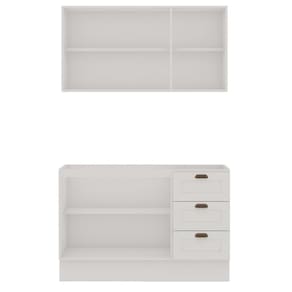 Um conjunto modular de cozinha sendo 2 peças: 1 armário aéreo 3 portas 120 cm, 1 balcão de 120 cm.