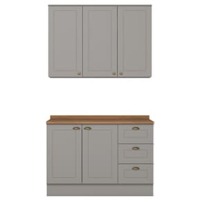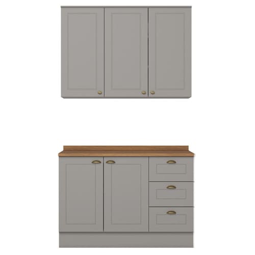 No estilo provençal com conceito inspirado nas cozinhas estilo americano. Um conjunto modular de cozinha sendo 3 peças: 1 armário aéreo 3 portas 120 cm, 1 balcão de 120 cm e 1 tampo de 120 cm. Todo o conjunto com estrutura feita 100% MDF de 15mm (fundo com 3mm, tampo em MDF de 25mm) , portas com dobradiças metálicas 35 mm com amortecimento e fechamento suave, e 3 gavetas com corrediças telescópicas, suportando 3kg cada, sua interna conta com 4 prateleiras espaçosas, cada uma suportando até 8 kg. Cozinha com acabamento em pintura UV texturizada, com portas e gavetas com detalhes de usinagem em baixo relevo que proporciona beleza e facilidade ao limpar, além do destaque em seus puxadores em metal zamac, tampo de 120 x 53,5 cm. Este móvel chegará na sua casa separado em 03 volumes.
