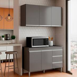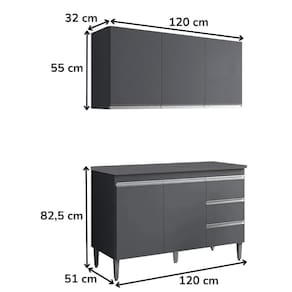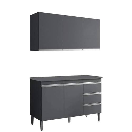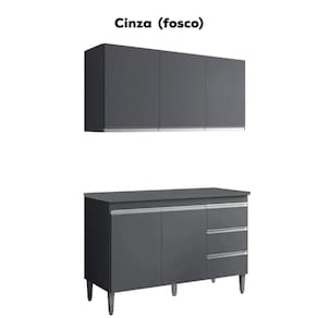 Armário Aéreo e Balcão com Tampo Andreia, ideal para otimizar o espaço da sua cozinha. Produzido em MDP 12/15 mm (fundo 3 mm) com acabamento em pintura UV. Possui portas e gavetas com dobradiças e corrediças metálicas, puxadores em alumínio e prateleiras internas. O balcão conta com pés em plástico com regulagem. Produto entregue em 03 volumes.