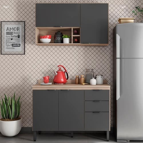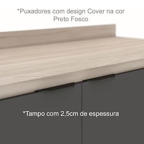 Armário Aéreo e Balcão Com, Módulos Firenze, com visual clean e moderno, conta com excelente qualidade e acabamento de alto padrão, possui estrutura em MDP de 15mm e tampo de 25mm de espessura, acabamento em pintura UV. Composta por 5 portas com dobradiças metálicas, sendo 1 porta basculante com pistão a gás, 2 gavetas com corrediças telescópicas com fechamento suave, prateleiras internas com amplo espaço para armazenamento, 2 nichos porta garrafas, 1 nicho para condimentos ou objetos decorativos, puxadores cover em plástico ABS na cor Preto Fosco, acompanha pés com regulagem de altura na cor Preta. Confira em nosso site outros módulos desta linha, você pode compor sua cozinha da forma que desejar e fazer diversas combinações. Estes móveis chegarão em sua casa separados em 3 volumes.